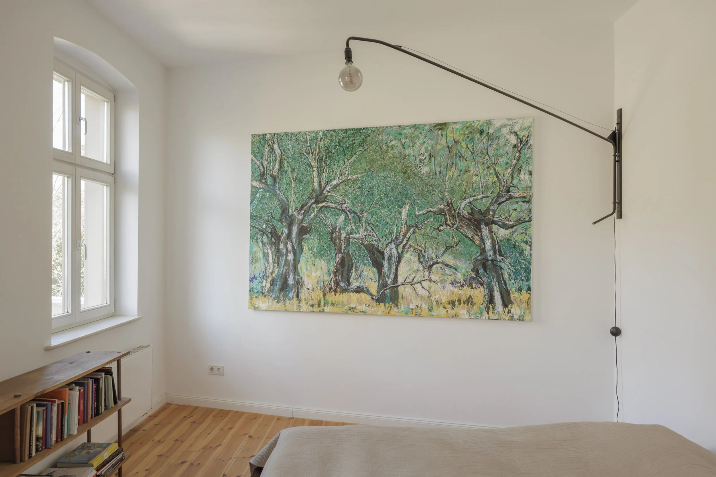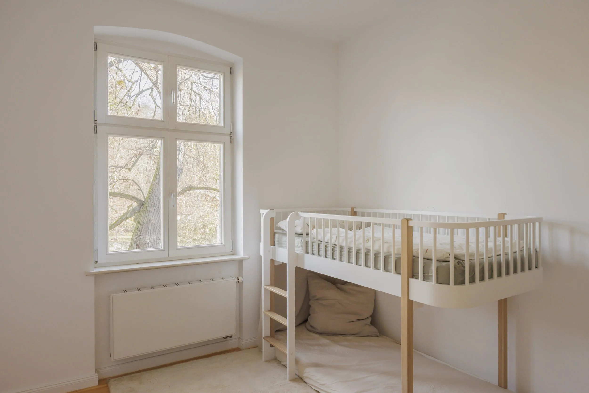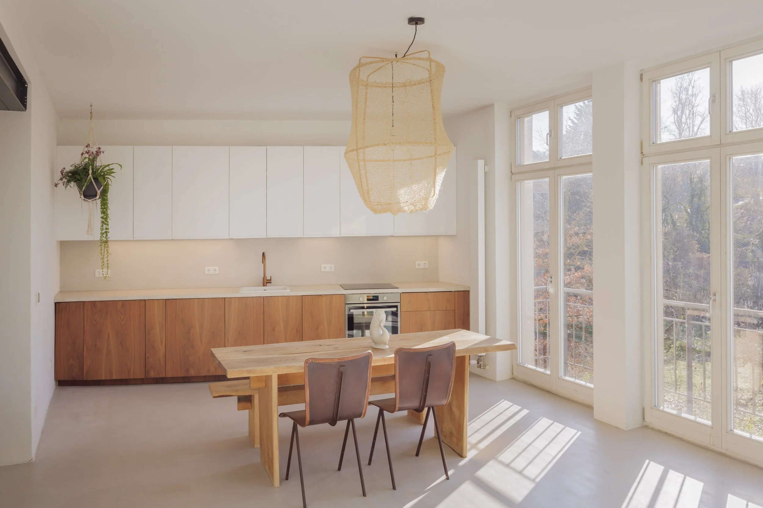 Viel Licht und Ruhe – Außergewöhnliches Apartment am direkt am WasserIm ersten Obergeschoss befindet sich die Wohnung, die mit einem weiten Blick über die grüne Landschaft des Babelsberger Parks beeindruckt. Der Ausblick auf das Wasser, hin zum Teltower Kanal und zum Tiefen See, entfaltet zu jeder Jahreszeit eine besondere Magie. Ein weiteres Highlight ist die großzügige Terrasse, die sich zum Wald hin öffnet. Sie bietet einen einzigartigen Rückzugsort, an dem man herrlich verweilen kann. Scheint dort am Morgen die Sonne zum Frühstück, wandert ihr Licht im Laufe des Tages weiter und erfüllt schließlich die nach Süden ausgerichtete Wohnküche.Die Räumlichkeiten bieten ausreichend Platz für eine Familie. Zur Verfügung stehen eine lichtdurchflutete Wohnküche, ein Schlafzimmer sowie ein flexibel nutzbarer Raum, der sich wahlweise als Arbeits- oder Kinderzimmer einrichten lässt. In der Küche schafft ein mehrlagiger Betonboden eine moderne, klare Atmosphäre. Das skandinavische Design der Küchenschränke setzt warme Akzente und sorgt für eine einladende Atmosphäre. Das Badezimmer ist mit eleganten italienischen Fliesen gestaltet. In den übrigen Wohnbereichen erzeugen lange Holzdielen ein harmonisches und wohnliches Gesamtbild.