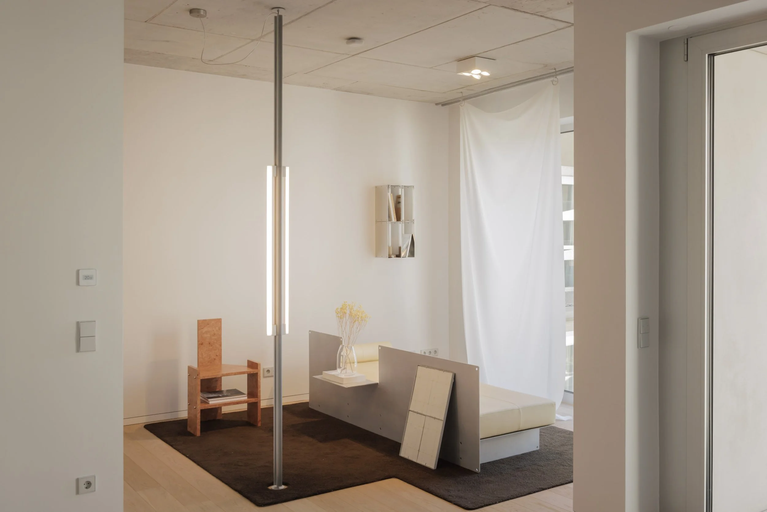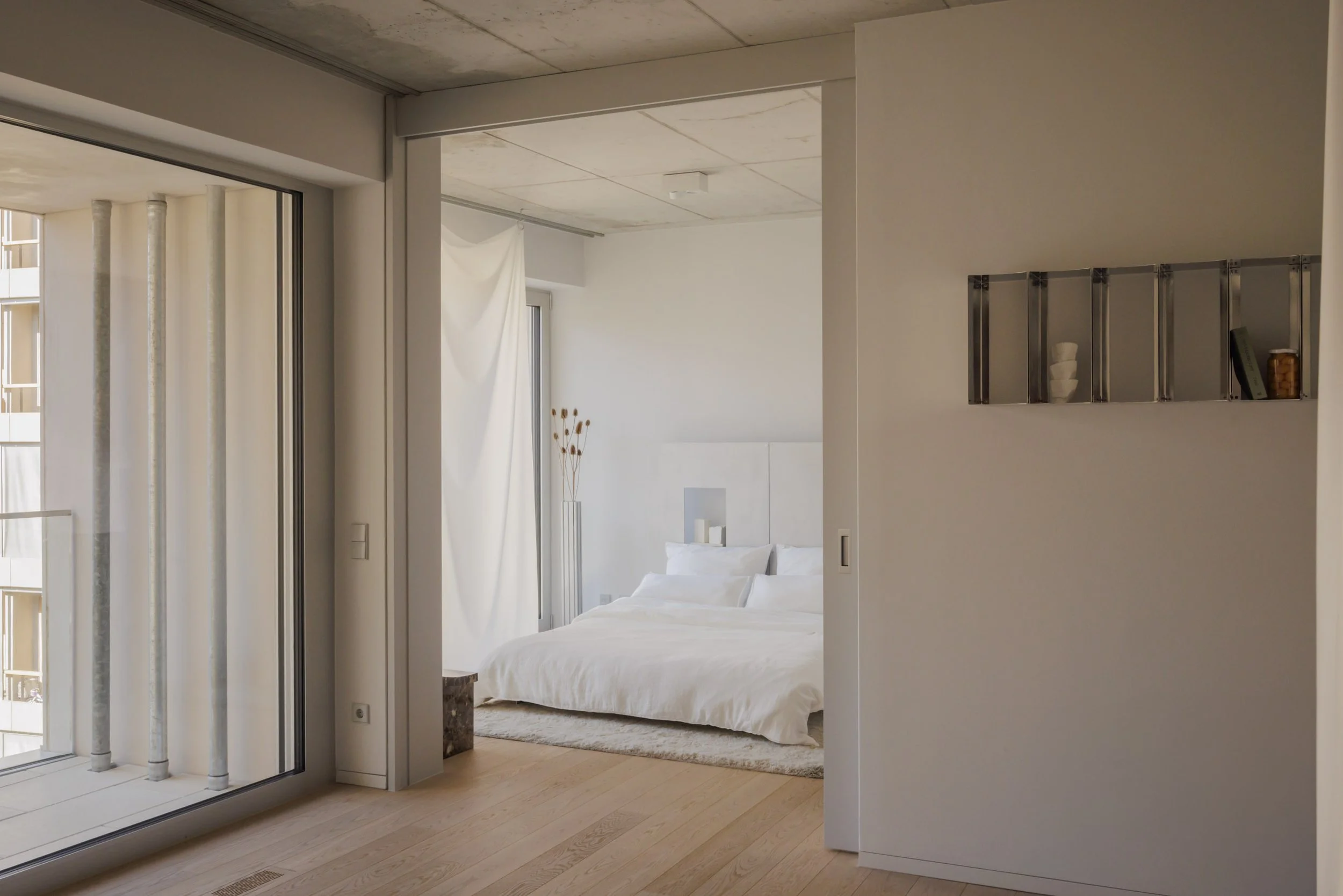 Auf der 4. Etage eröffnet diese 2-Zimmer-Suite mit ca. 61,82 m² ein modernes, elegantes Wohngefühl. Raumhohe Fenster, Sichtbetondecken und Echtholzparkett prägen das klare, reduzierte Design. Die Ausstattung kombiniert hochwertige Manufakturküchen mit Geräten von Miele & Bora, maßgefertigte Einbauschränke und das charakteristische Interior von Lotto Studio – bekannt für seine minimalistische Ästhetik, feine Materialien und die besondere Verbindung von Funktionalität und Design. Die Loggia mit Blick auf den privaten Innenhof erweitert den Wohnraum und bietet einen ruhigen Rückzugsort.