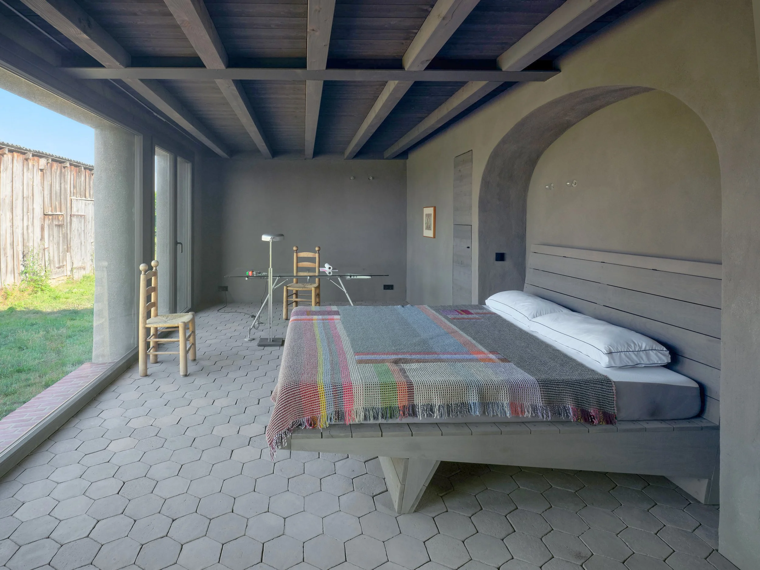 ⬘ monochrome, erdige Farbigkeit durch Materialien wie hölzernes Dachtragwerk, Lehmputz an den Wänden und gebrannte Tonkacheln