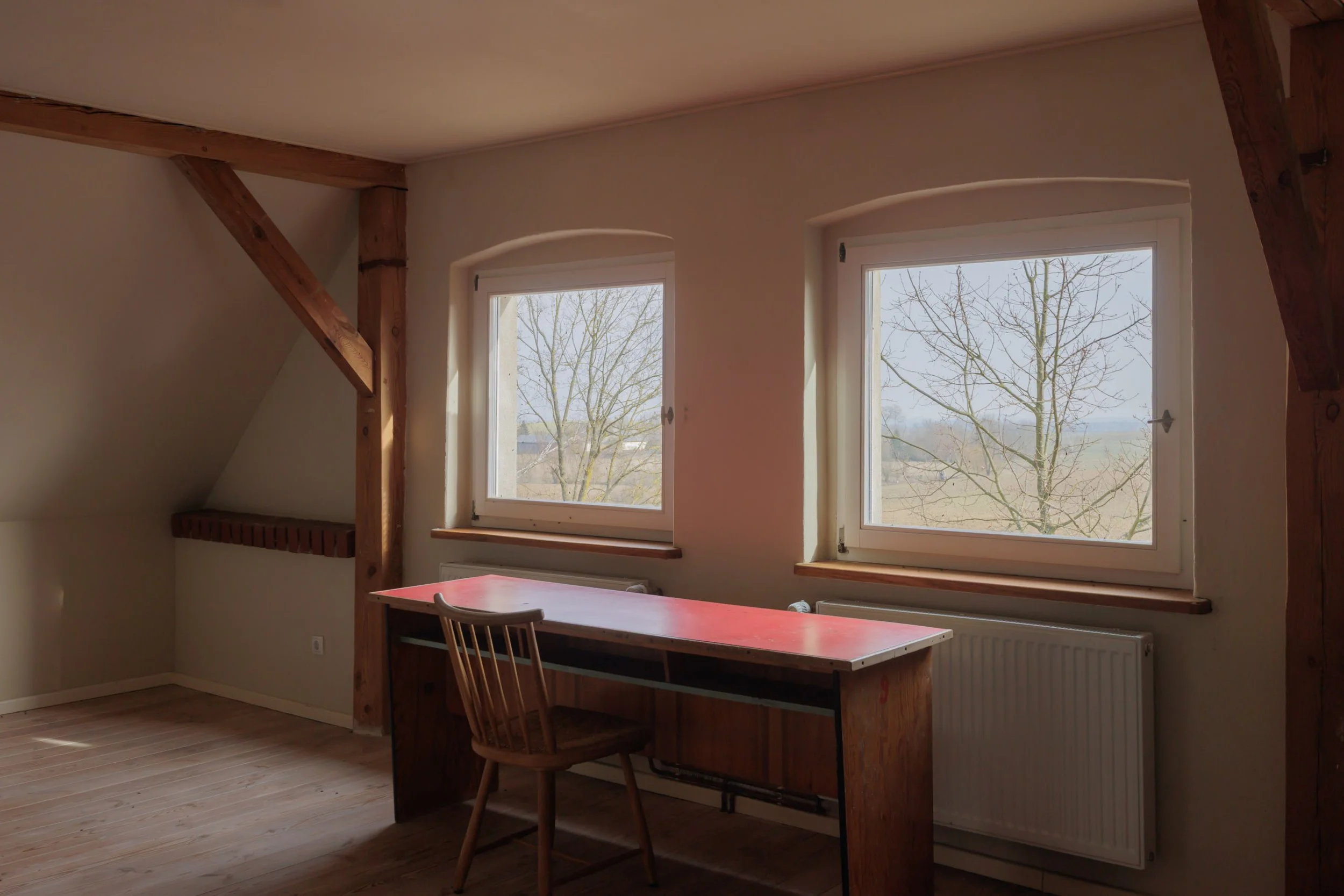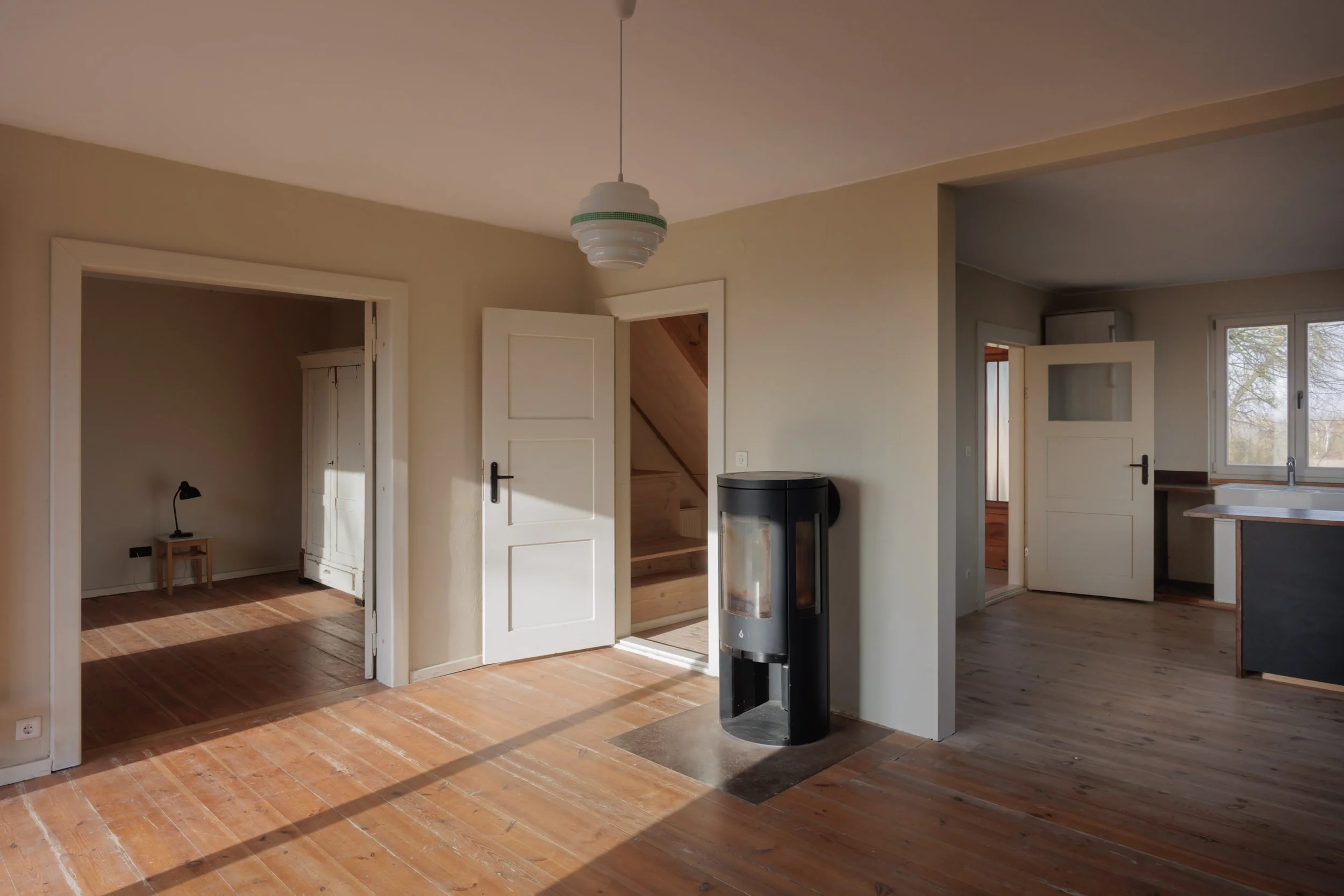 Das Einfamilienhaus aus dem Jahr 1935 verfügt über eine Wohnfläche von rund 90 m², verteilt auf fünf Zimmer sowie ein Badezimmer. Die Grundsubstanz ist solide und wesentliche Modernisierungen wurden bereits durchgeführt. Dazu gehören neue 3-fach-verglaste Fenster, hochwertige Holztüren sowie ein 2006 erneuertes Dach. Das Gebäude ist teilweise unterkellert und bietet praktische Nebenflächen für Lager- und Haustechnik. Besonders hervorzuheben ist das große Ausbaupotenzial. Der Dachstuhl umfasst etwa 300 m² und eignet sich hervorragend für zusätzliche Wohn- oder Nutzflächen. Ergänzend ist ein ehemaliger Stall mit rund 140 m² direkt in das Gebäudeensemble integriert, ebenfalls mit sehr guter Ausbauperspektive. Dadurch ergibt sich ein hohes Maß an Flexibilität für individuelle Wohn-, Arbeits- oder Projektlösungen. Die technische Ausstattung umfasst eine Gas-Zentralheizung mit versenktem Gastank sowie eine Kombitherme zur Warmwasserbereitung. Das Haus ist an die öffentliche Kanalisation angeschlossen und verfügt über einen Glasfaseranschluss, der eine moderne digitale Infrastruktur sicherstellt – ein wesentlicher Vorteil in dieser Lage. Hinter dem Haus befindet sich eine Terrasse mit freiem Blick in die offene Landschaft.