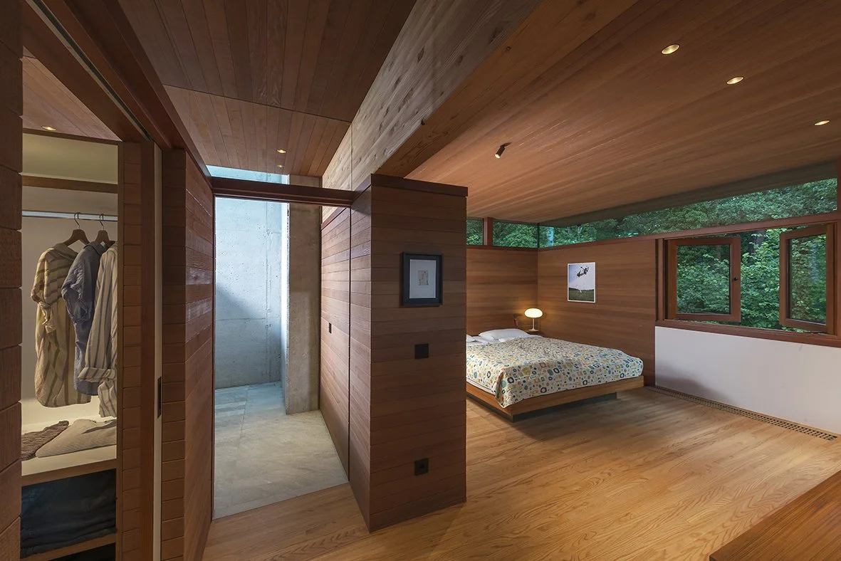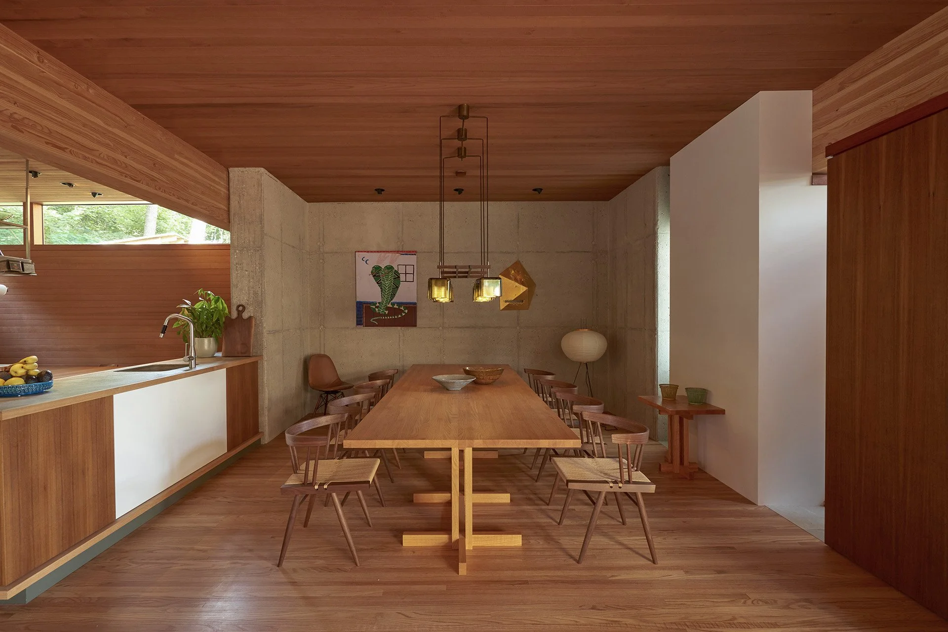⬘ Materialharmonie aus Glas, Redwood- und Douglasie-Holz, typisch für die kalifornische Moderne