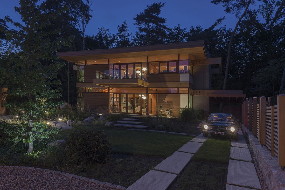 Auf einem rund 1.000 m² großen, nach Süden ausgerichteten Grundstück entfaltet die Villa ihre besondere Wirkung. Alte Kiefern rahmen den Außenbereich, dessen japanisch inspirierte Gartenarchitektur eine ruhige, harmonische Atmosphäre schafft. Wasser, Holz und Stein formen eine moderne, meditative Landschaft. Die Residenz ist das einzige in Europa realisierte Wohnhaus des kalifornischen Architekten Ray Kappe. Sein Mid-Century-Modern-Stil zeigt sich in langen Linien, klarer Struktur und großzügigen Glasflächen. Innen- und Außenbereiche gehen durch fließende Übergänge ineinander über, während fein definierte Raumzonen gezielte Privatsphäre ermöglichen. Zwei massive Betonkörper bilden das konstruktive Zentrum, ergänzt durch handwerklich gefertigte Redwood- und Douglasie-Elemente. Das lichtdurchflutete Atrium bildet das Herz des Hauses und verbindet Küche, Ess- und Wohnbereich zu einer offenen Raumkomposition. Eine abgesenkte Lounge mit Kamin sorgt für Geborgenheit; im Obergeschoss schafft eine Galerie ein dynamisches Spiel aus Licht und Schatten. Hochwertige Materialien wie Eichenparkett, eine japanische Ofuro-Badewanne und ein modernes Smarthome-System unterstreichen den exklusiven Anspruch. Handwerkliche Details verleihen der modernen Architektur eine warme, authentische Note.