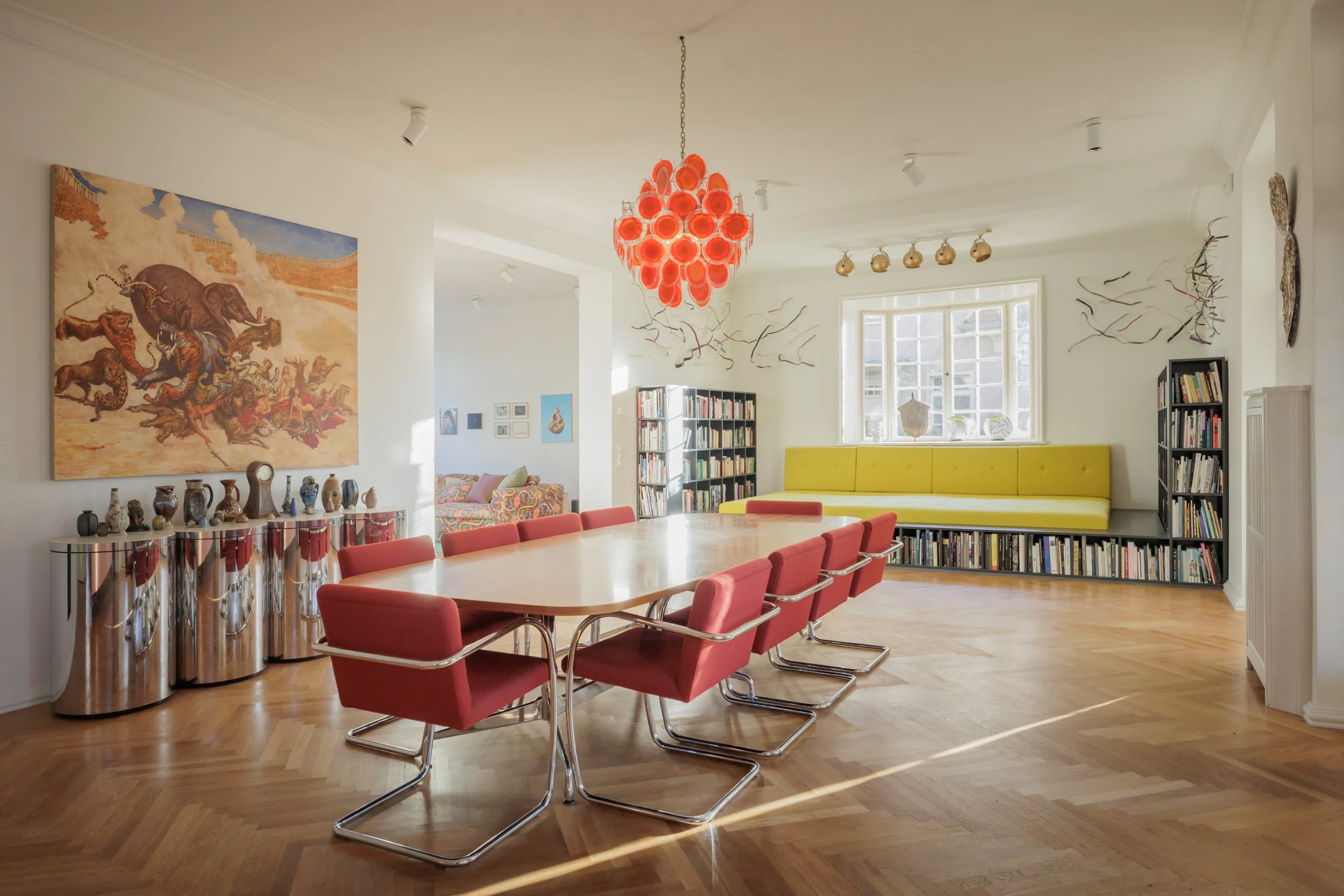 In Villa Edelstein, Eugen Schmohl created a residence of exceptional elegance and sophistication. Originally conceived as a prestigious family home, the restored villa once again offers an unusually varied sequence of rooms: Facing the street are the entrance hallway, living room, and the classic former study, while the kitchen, pantry, and a bright dining room with bay window are oriented toward the garden side. The upper floor is dedicated to the private quarters and bedrooms, arranged around a central hallway. This level features two exceptional bathrooms, which complement the atmosphere of the house with their high-quality materials, meticulously coordinated colouring, and British interiors.