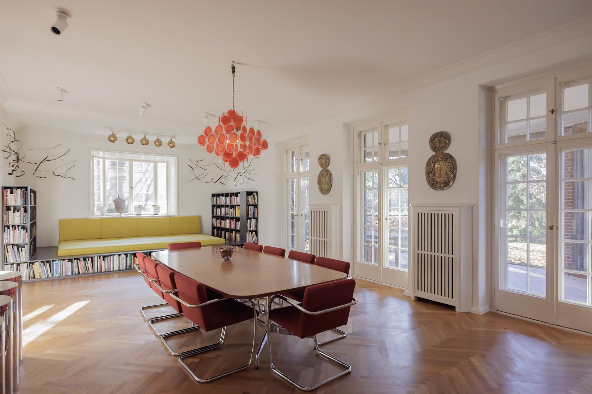 Villa Edelstein is located in the Berlin district of Dahlem, one of the capital‘s most exclusive residential addresses. The surrounding area is characterized by detached villas from the 1920s, well-maintained gardens, and a tranquil, green cityscape. The neighbourhood features high-quality residential properties and several embassies. Directly opposite the villa is Domäne Dahlem, a historical country estate featuring an organic farm, a museum, and offering cultural events. Shopping facilities, educational institutions, and medical services are of the highest quality and very easily accessible. Bus and underground (U-Bahn) connections are within walking distance, while Pacelliallee itself experiences moderate traffic volumes.Elegance in the Details – The Rediscovery of a Berlin Villa