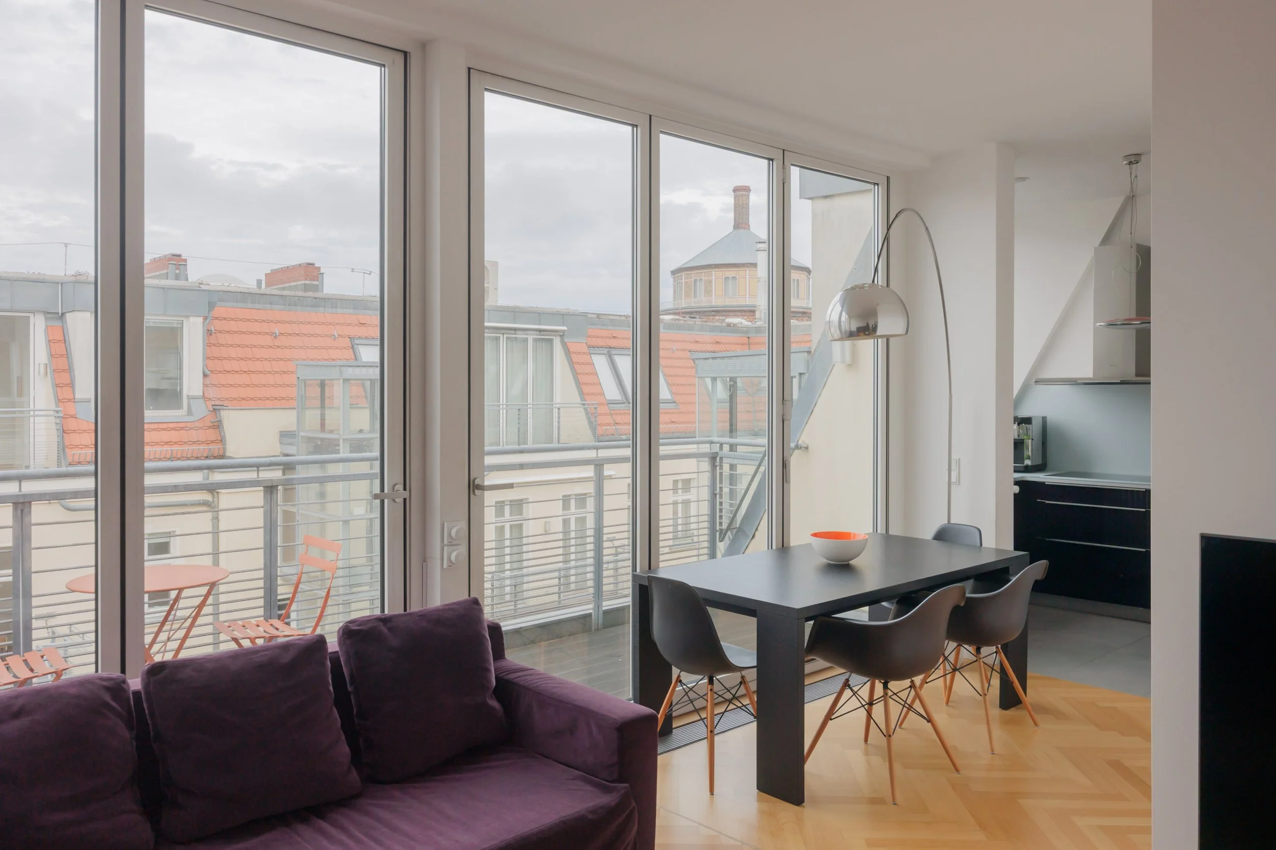 ⬘ Wohn- und Essbereich im 5. OG mit Panoramafenstern, Sonnen-Terrasse und schicker Einbauküche