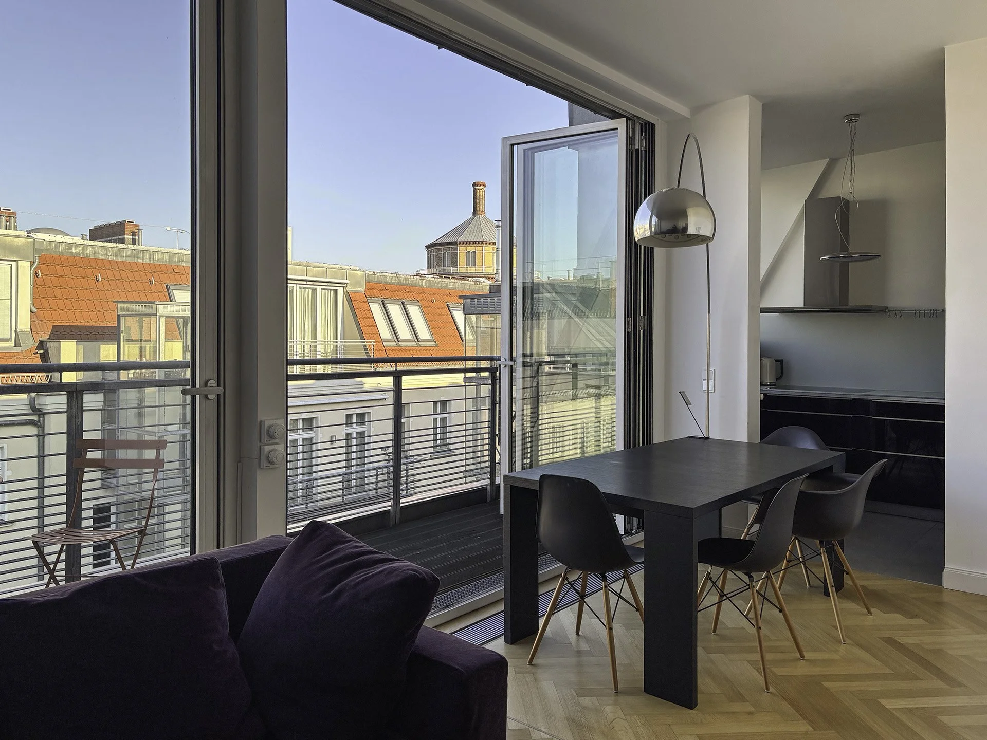⬘ Großzügiger Wohn- und Essbereich im 5. OG mit Panoramafenstern, Sonnen-Terrasse und schicker Einbauküche
